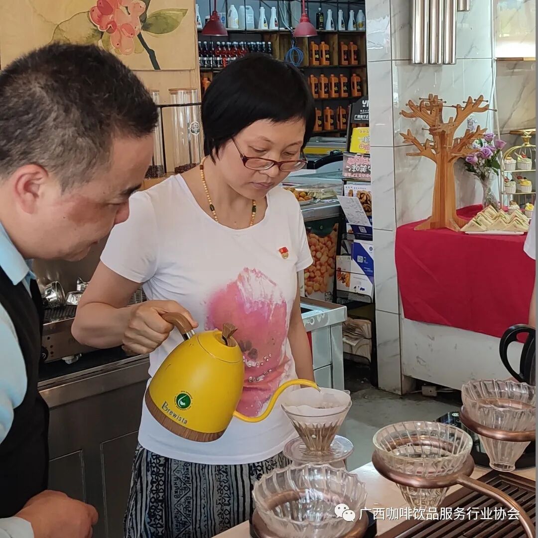 咖啡饮品品鉴分享环节由仲马咖啡技术培训中心胡武辉,玩茶专家、广西横县南方茶厂技师朱小米对咖啡、果茶及奶茶等饮品的制作进行专业知识培训,特别是对食材的选择、用量、步骤要求等做了详细讲解,在培训师的指导下,参加活动的青年干部纷纷动起手亲身体验制作一杯手冲咖啡、饮品的乐趣,提升个人技能。