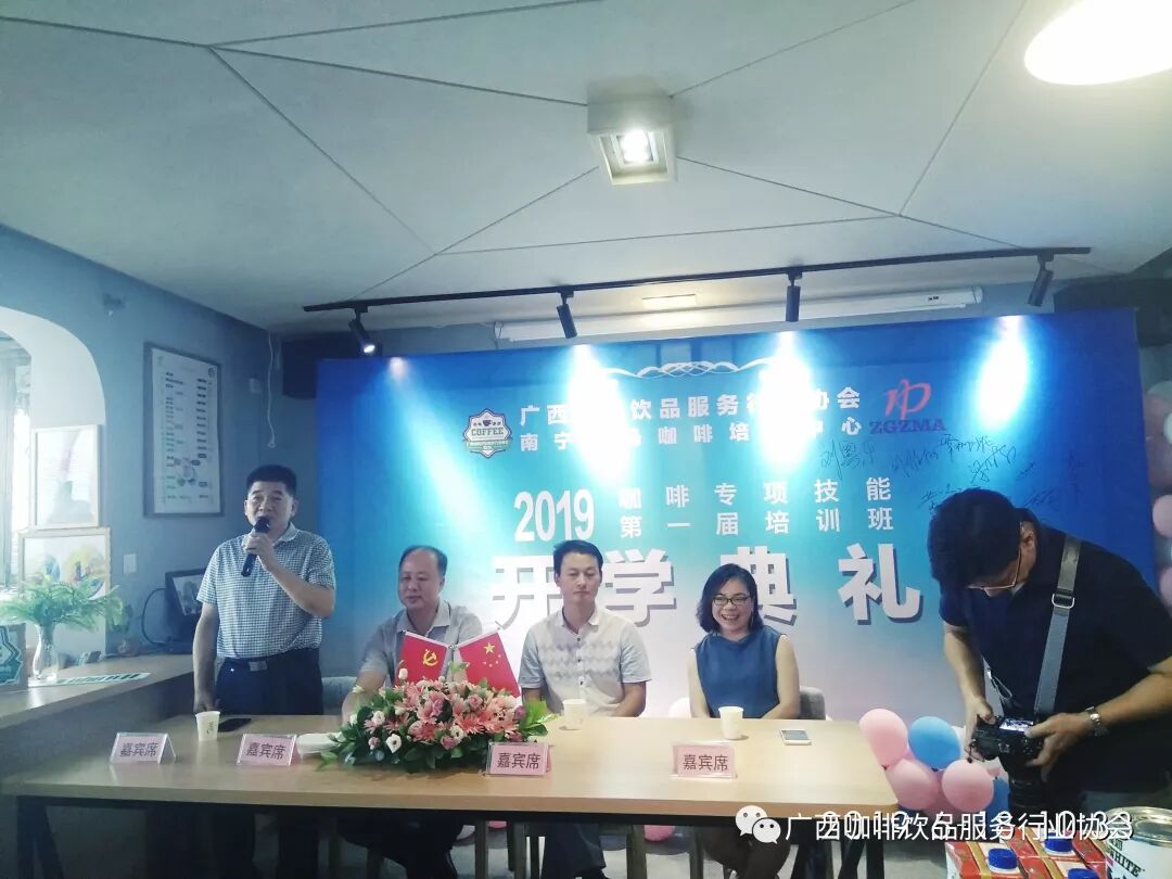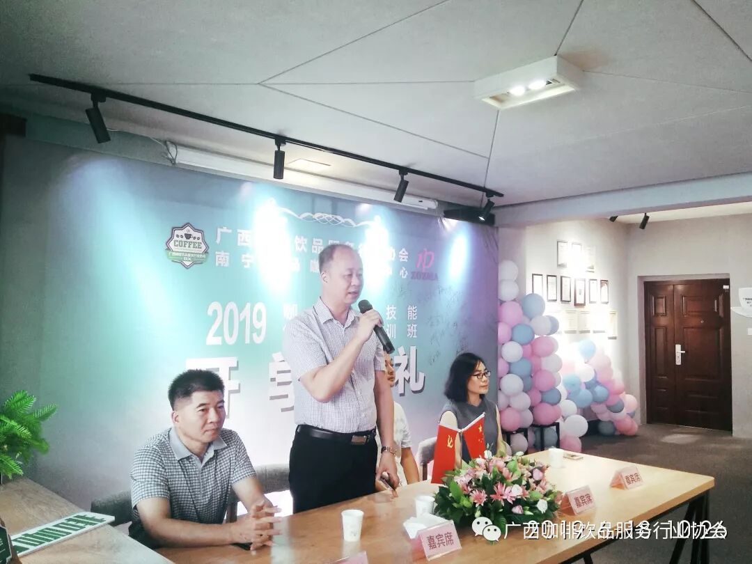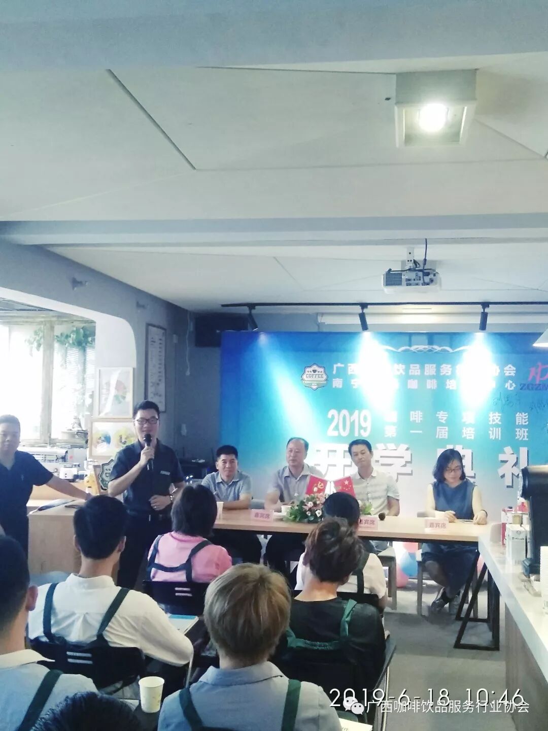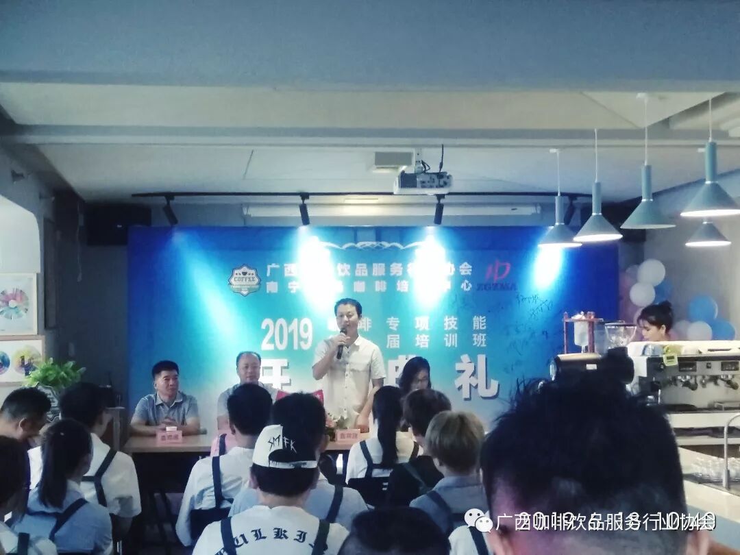 夯实6月,天蓝风轻,阳光灿烂, 6月18日上午,由广西咖啡饮品服务行业协会授权,广西仲马咖啡餐饮服务有限公司主办的2019年度“咖啡制作”专项职业能力培训班第一期开学典礼正式启航。广西咖啡饮品服务行业协会会长刘粤东、党支部书记玉保钢、秘书长刘维松、专业委员会主任杨勇等各界领导精英出席了本次典礼并致辞。