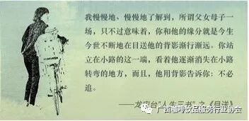 “我慢慢地、慢慢地了解到,所谓父女母子一场,只不过意味着你和他的缘分就是今生今世不断地在目送他的背影渐行渐远。你站在小路的这一端,看着他逐渐消失在小路转弯的地方,而且,他用背影默默告诉你:不必追。”