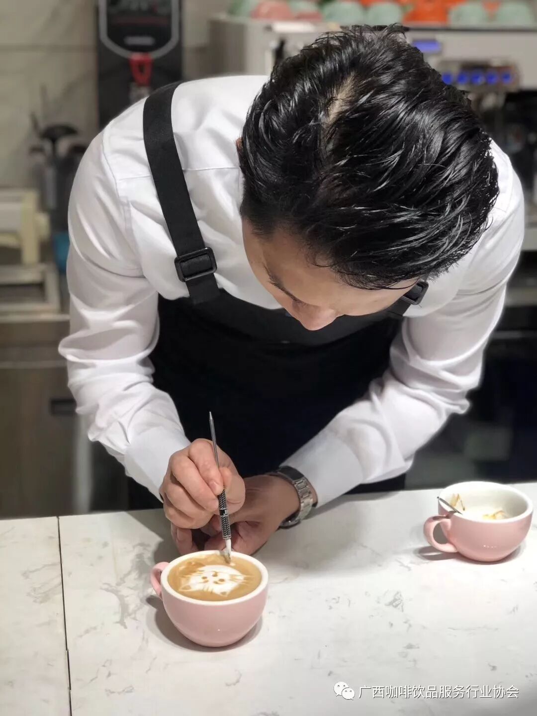 苏宁老师开始为大家展示花式拿铁,你可以跟他说自己想要的图案,他会如行云流水的熟练做出来。刘会长对我说“来,专门为你准备的,你挑挑要什么图案”,我说我就要一只小猫吧!苏宁老师颜值担当,让我有一种错觉是不是每个拉花的咖啡师都如此,或者说,你其实是在看一个认真专注的人,他身上散发着的职业的魅力。