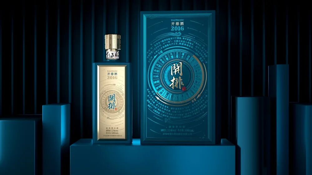 开排是琅琊台中国海洋生态白酒独特的工艺,产品主色调以海洋蓝延伸出独特的品牌专属色”开排蓝“,瓶身设计从瓶盖和圆盘图形体现一年 24 节气“循环”的概念,同时以工艺强调从“春分”压排到“秋分”的开排酿造过程,以此表现开排酒的发酵时间之长,品质之好。瓶身侧面的水纹在起到便于拿握的作用的同时,也和琅琊台集团“向海洋要效益,海洋生物 赋能白酒酿造”的海洋生态酒理念相契合。酒瓶与盒型上的棱台结构则呼应了窖池的形状,“粮是酒之母,窖是酒之褓”,打开包装的过程,也是“开排”的过程。