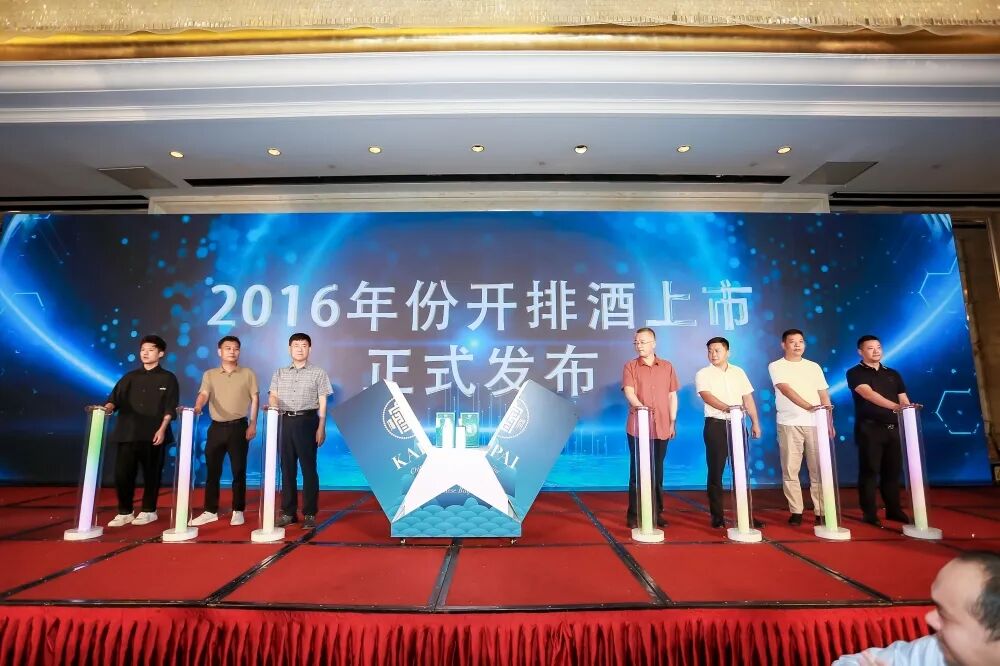 李悦明董事长与刘青松设计师、张永双总监、李全勇董事长、黄宝贵董事长、孙璟琨董事长、袁世林董事七位嘉宾上台,共同启动2016年份开排酒上市发布仪式。