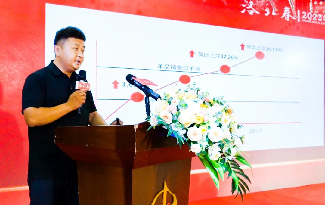 山东洛北春集团销售负责人韩帅,对本次会议进行战略性阐述,并汇报了白板酒连续5年屡创新高的销售战绩。他强调白板联盟的第一宗旨就是“保护联盟权益,保证联盟利益”。23年度,我们积极学习国内一线品牌酒企销售思路,率先引进套码返利模式,在区域酒企里已经是先行者。