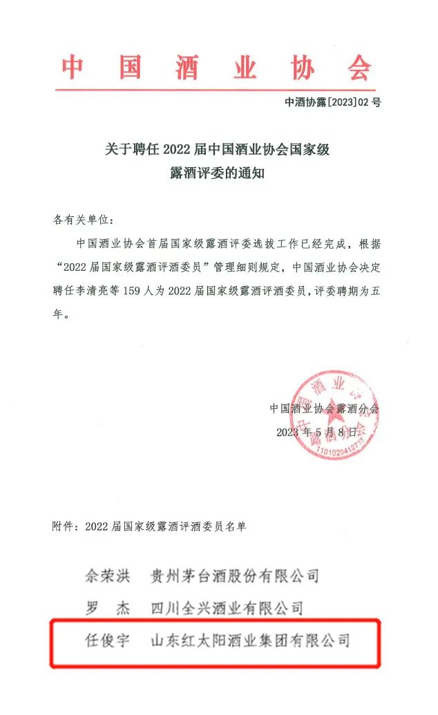近日,中国食品工业协会发布了《关于聘任第十届白酒评委的通知》,中国酒业协会发布了《关于聘任2022届中国酒业协会国家级露酒评委的通知》,红太阳酒业孙守营、杨攀华获聘“中国食品工业协会第十届白酒国家评委”,任俊宇获聘“中国酒业协会首届国家级露酒评委。杨攀华和任俊宇作为酿酒技术领域的后起之秀,他们凭借专业的知识素养和突出的业务技能,再一次向行业和社会强有力地展现了公司“以高水准人才建设驱动产品质量提升”的核心发展战略。