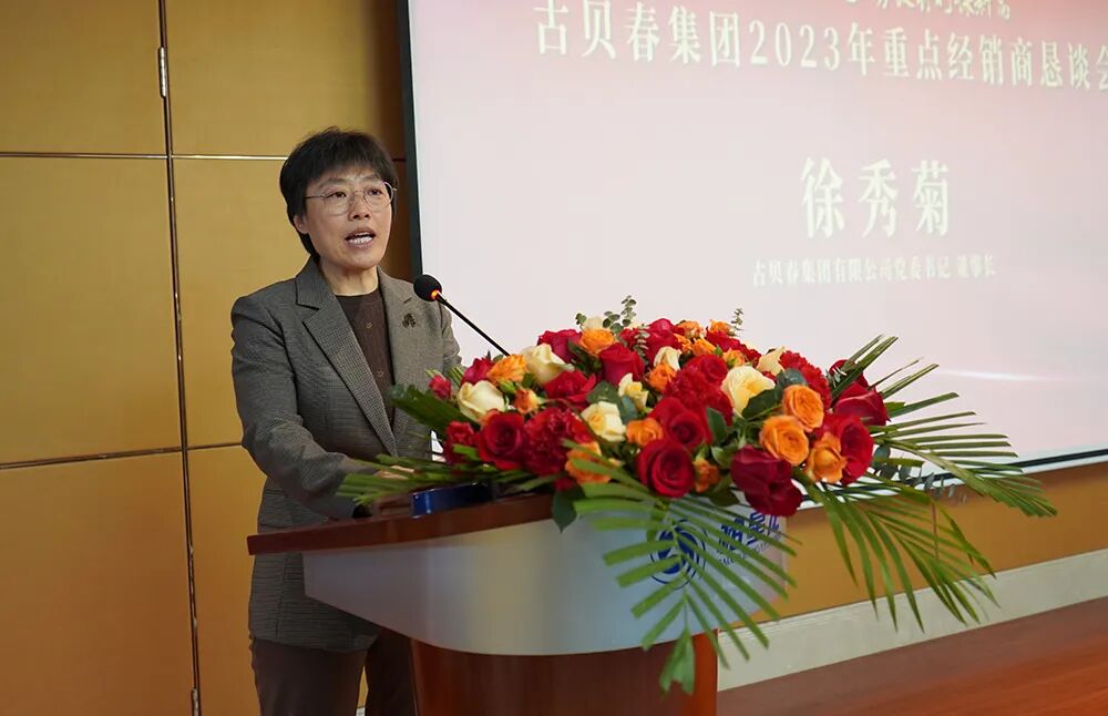 会上,古贝春集团党委书记、董事长徐秀菊作了重要讲话。徐秀菊董事长对一年来公司各方面取得的成绩给予了充分肯定。要求公司营销工作要坚决贯彻落实公司各项决策部署,与广大经销商朋友携手,坚定信心、强抓机遇、乘势而上,推进古贝春事业再上新台阶。对2023年的工作,徐秀菊董事长提出了三点希望:一是厂商一家亲。要充满发展自信、抓住发展机遇、实现发展新突破;二是发展高质量。要讲好古贝春故事,充分发挥古贝春品牌优势;三是做事讲规则。要着眼长远利益,谋求实现多赢。徐秀菊董事长在讲话的最后表达了对企业未来发展的美好期许,她相信在全体经销商朋友们鼎力支持和配合下,古贝春的明天会更加美好!