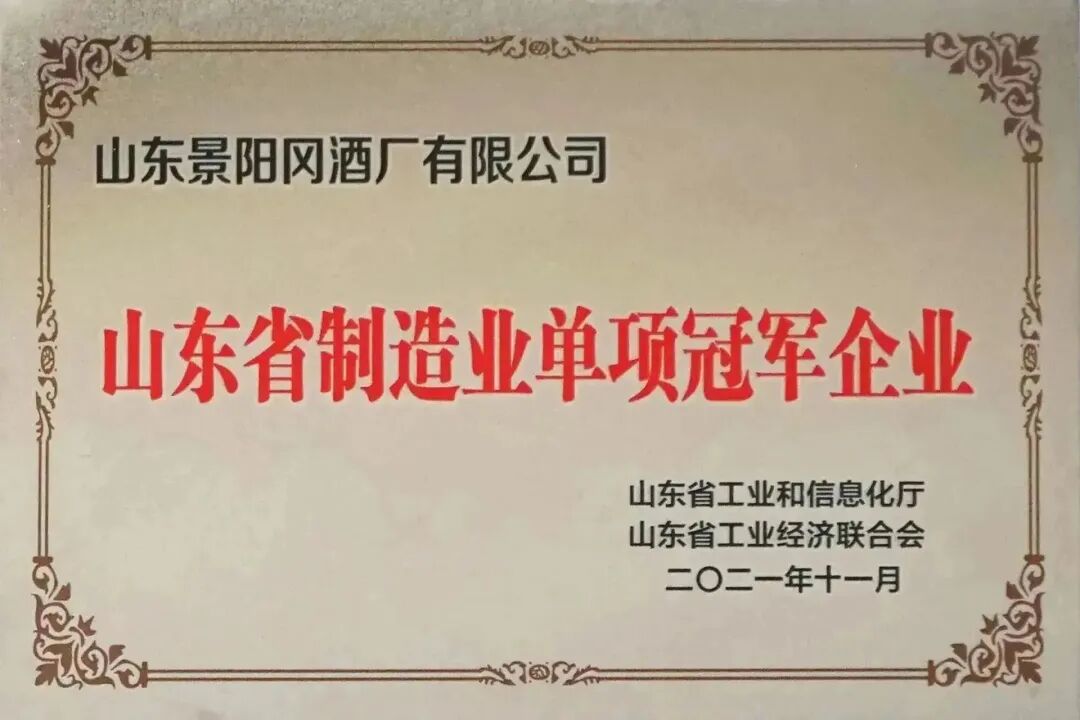 景阳冈酒业先后荣获“山东省专精特新企业”“山东省高端品牌培育企业”“山东省技术创新示范企业”“山东省瞪羚企业”“山东省质量标杆企业”“山东省制造业单项冠军企业”“全省食品产业高质量发展表现突出集体”“第七届山东省企业管理创新成果奖”。