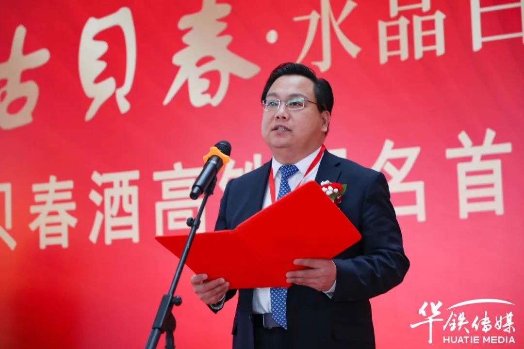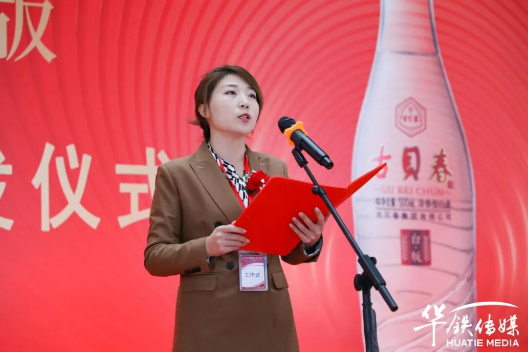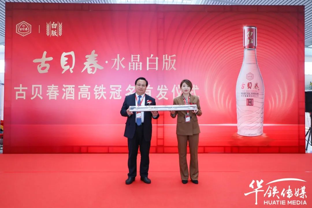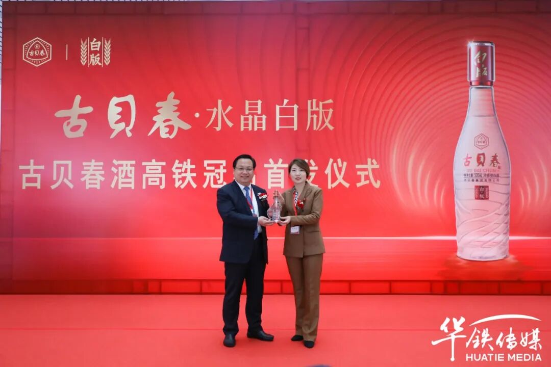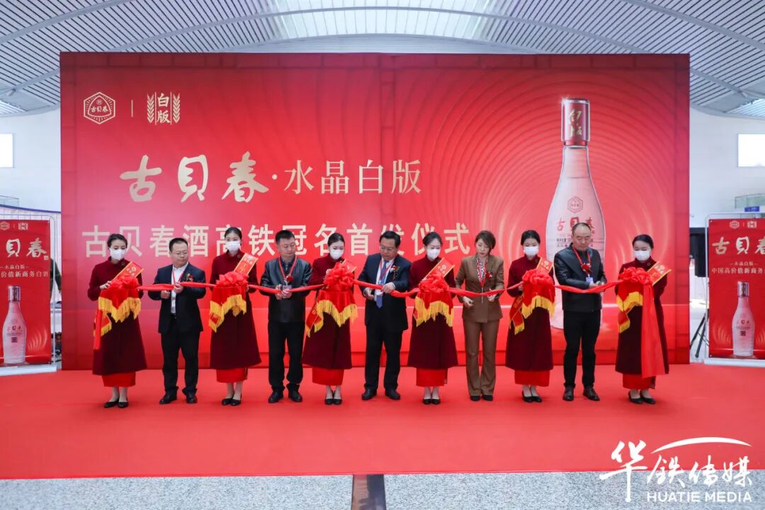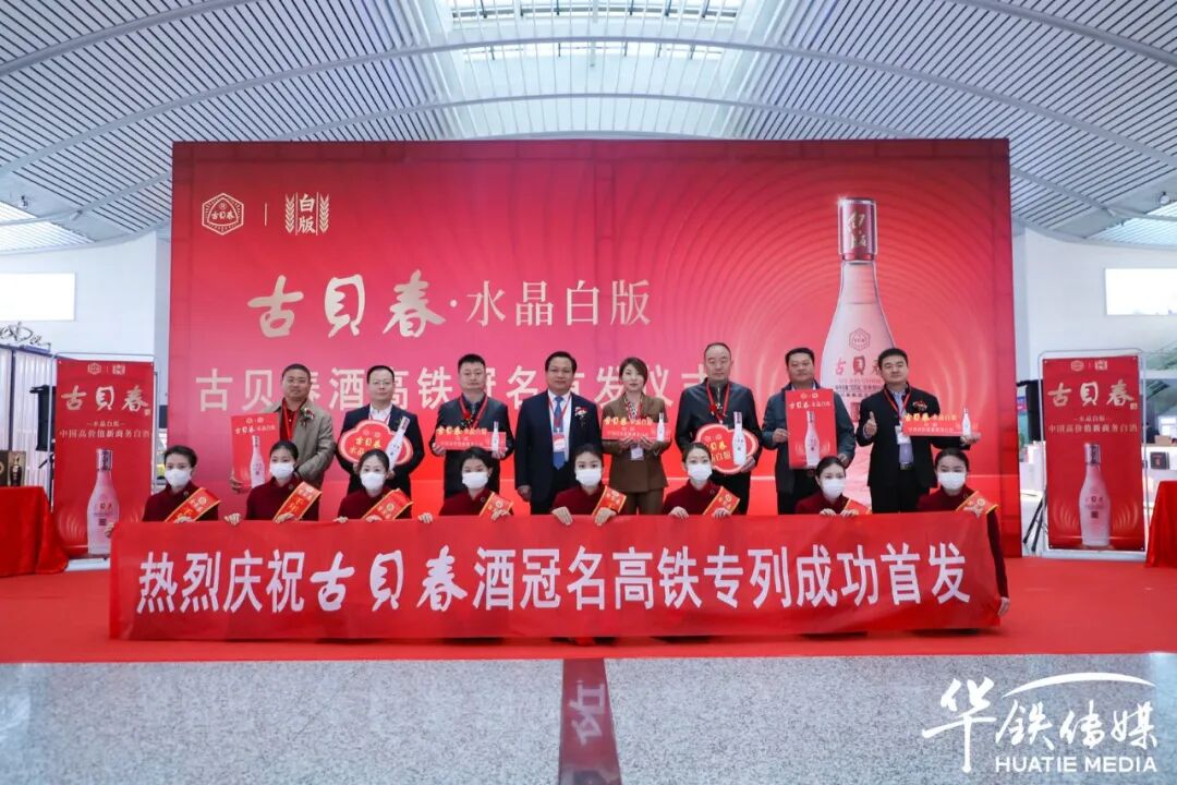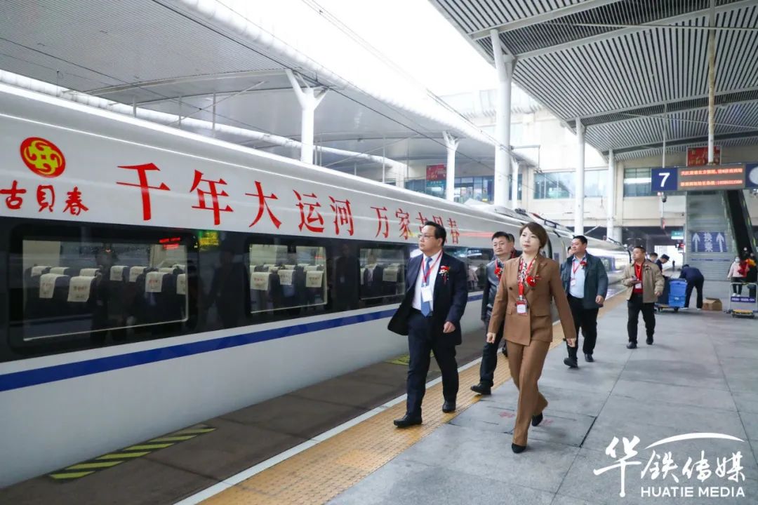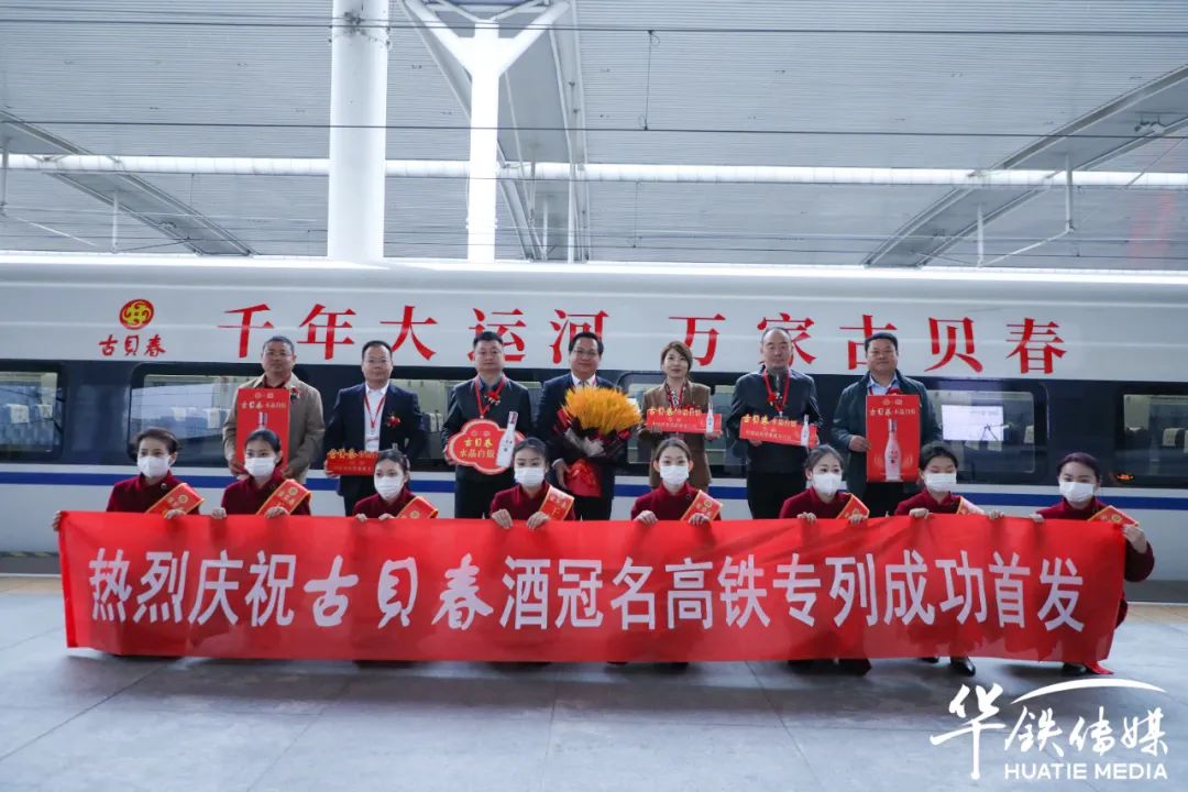 车身上印有“千年大运河,万家古贝春”的古贝春高铁专列从济南西站徐徐驶出