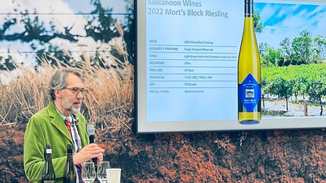 张裕旗下澳大利亚克莱尔谷歌浓酒庄展台,德国葡萄酒评论家Stuart Pigott正在向现场嘉宾介绍歌浓酒庄雷司令产品
