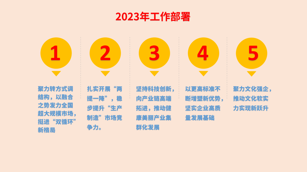 2023年,集团继续坚持“融合创新 两提一降”的工作方针,以学习贯彻党的二十大精神为指引,增强“一分部署 九分落实”的意识,弘扬善良感恩、团结奋斗的大爱精神,坚持海洋生态白酒、海洋微藻、海洋功能肽、有机酸、功能糖、营养健康食品等健康美丽产业战略定位,保持“质量精益求精 服务尽善尽美”的精神状态,突出效益核心,融入市场新格局,不断推进五大战略任务走深走实,促进精细化服务提质增效,加快向市场型、消费型企业转换升级。