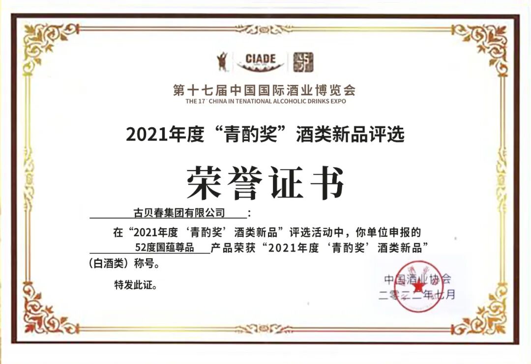 52°国蕴尊品荣获2021年度青酌奖酒类新品。