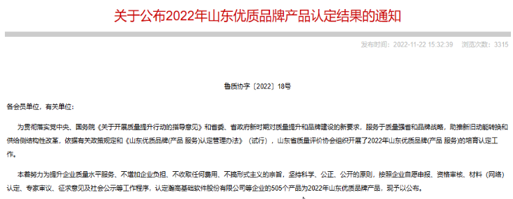 古贝元酱香型系列白酒被山东省品牌建设促进会评定为2022年度山东知名品牌。
