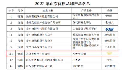古贝春浓香型白酒被山东省质量评价协会评定为2022年度山东优质品牌产品;
