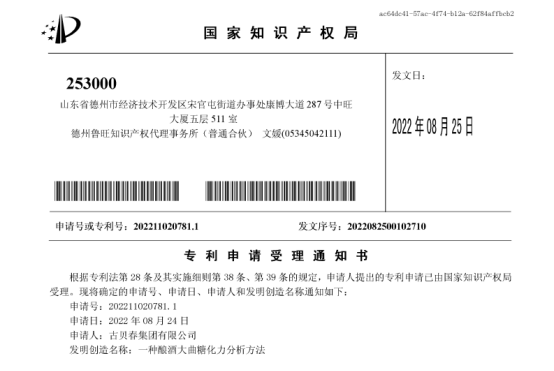 古贝春科创小组技术创新项目中的创新实验方法《一种酿酒大曲糖化力分析方法》申请发明专利1项;