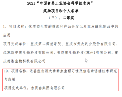 《浓香型白酒大曲曲虫生理习性及信息素诱捕技术研究与应用》项目荣获中国食品工业协会科学技术奖二等奖。