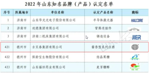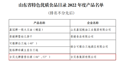 2021年古贝春浓香白酒(38°,42°)被山东省工信厅列入山东省特色优质食品目录;2022年古贝元牌酱香白酒(46°,53°)再次被列入山东省特色优质食品目录。