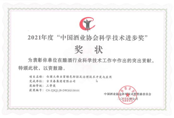 《白酒大曲虫害绿色防控及治理技术研究》项目荣获中国酒业协会科学技术进步奖三等奖。