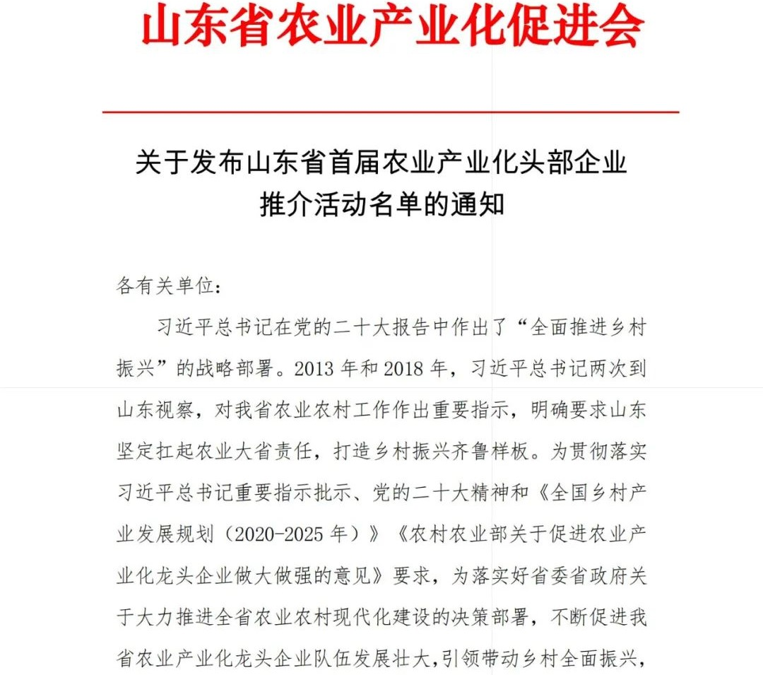在山东省农业产业促进会、山东省品牌建设促进会组织开展的山东省首次农业产业化头部企业评审推介工作中,我公司被确定为“2022年度山东省农业产业化头部企业”。