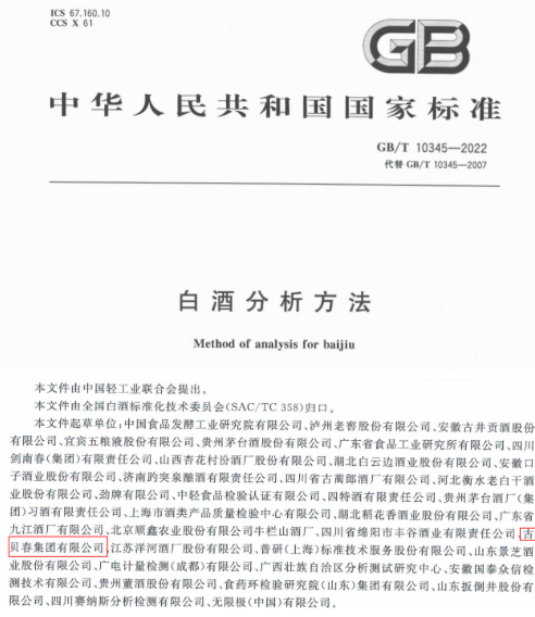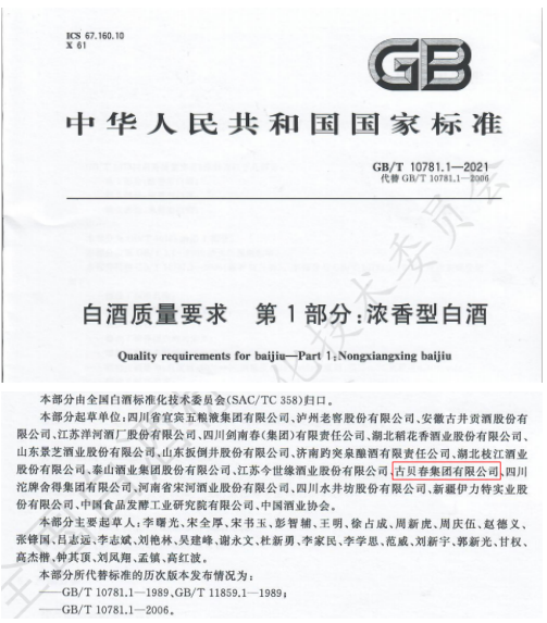 参与国标委制修订的《白酒质量要求第1部分:浓香型白酒》《白酒质量要求第4部分:酱香型白酒》《白酒分析方法》3项国家标准,其中2项已发布实施;参与制定《白酒瓶口设计通用要求》1项团体标准。
