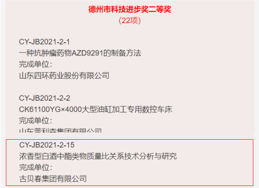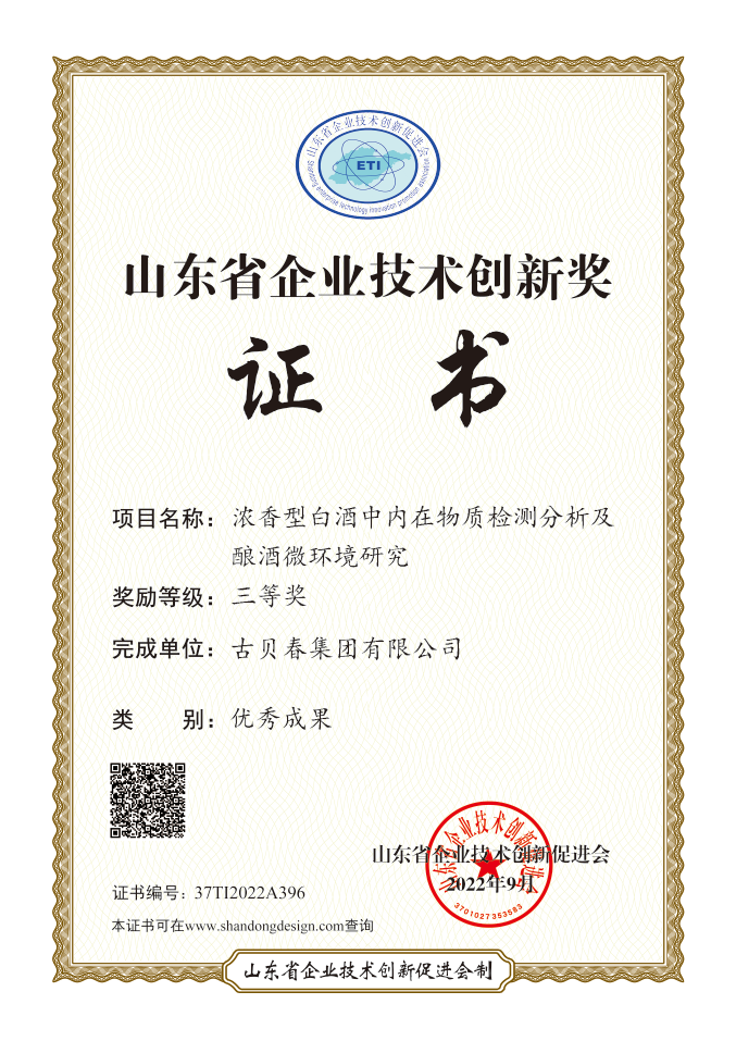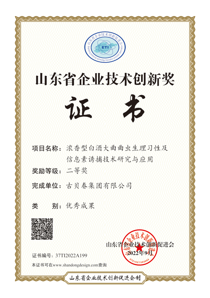 《浓香型白酒大曲曲虫生理习性及信息素诱捕技术研究与应用》和《浓香型白酒中内在物质检测分析及酿酒微环境研究》两个项目分别荣获山东省企业技术创新优秀成果奖二等奖及三等奖。