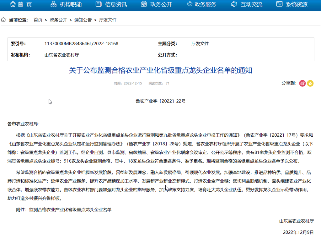 在山东省农业农村厅组织开展的农业产业化省级重点龙头企业运行监测工作中,我公司通过农业产业化省级重点龙头企业监测。