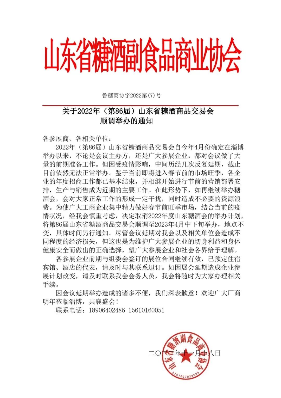 关于2022年(第86届)山东省糖酒商品交易会顺调举办的通知