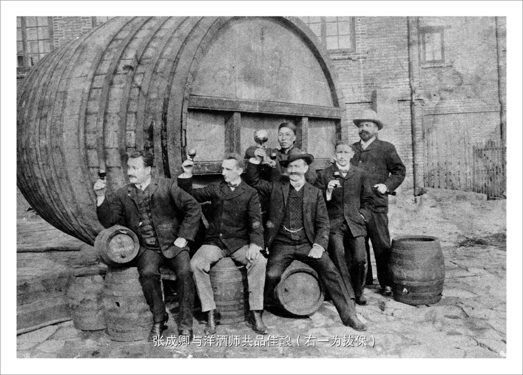 张裕第一任总经理张成卿与外国酿酒师举杯庆祝第一桶可雅白兰地上市