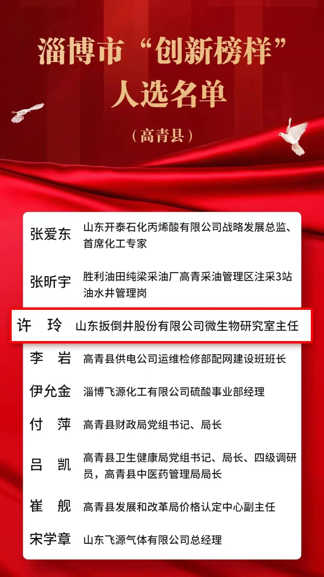 10月10日,淄博市委组织部通报表扬了淄博市“创新榜样”,山东扳倒井股份有限公司微生物研究室主任许玲被评为“科技研发创新”榜样。