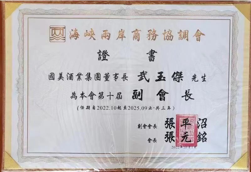 9月29日,海峡两岸商务协调会通过线上召开会议,会上张平沼会长向国美酒业集团董事长武玉杰颁发聘书,聘为该会第十届副会长。