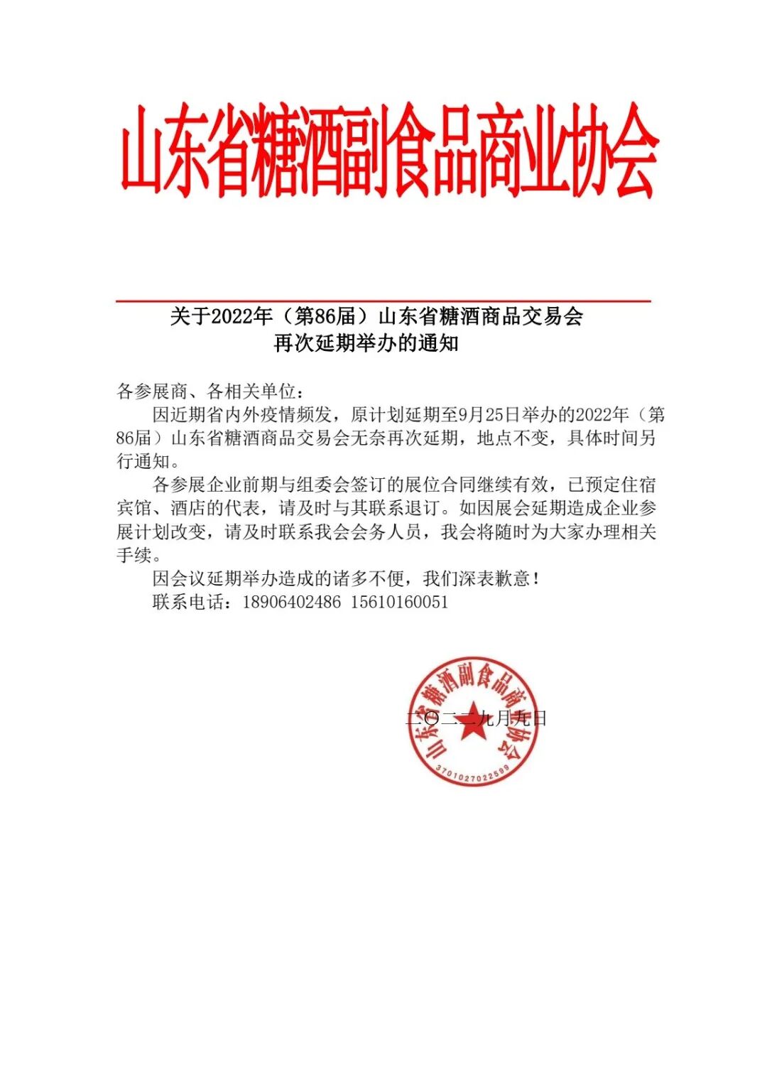2022年(第86届)山东省糖酒商品交易会再次延期