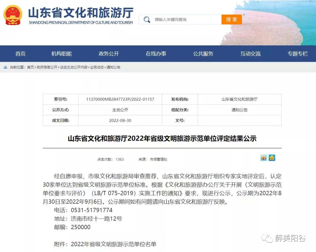近日,山东省文化和旅游厅官网发布《山东省文化和旅游厅2022年省级文明旅游示范单位评定结果公示》,景阳冈酒文化旅游景区入选。