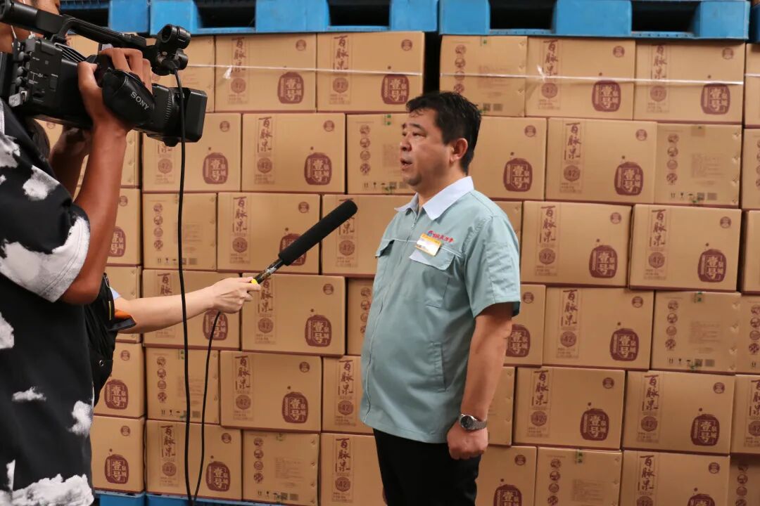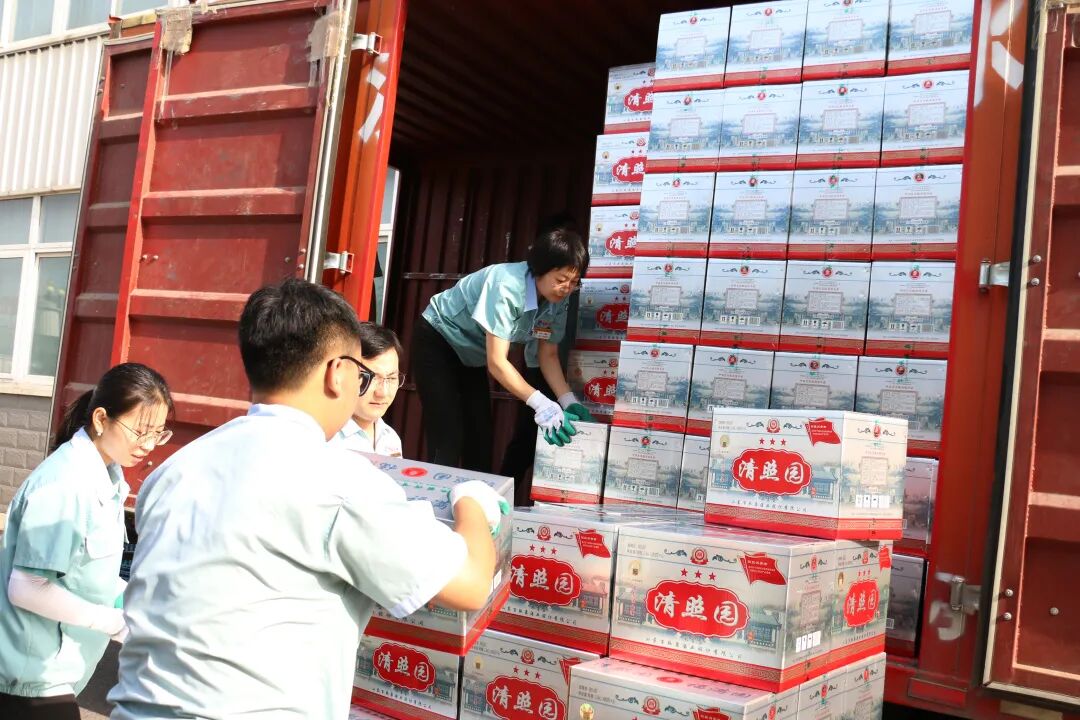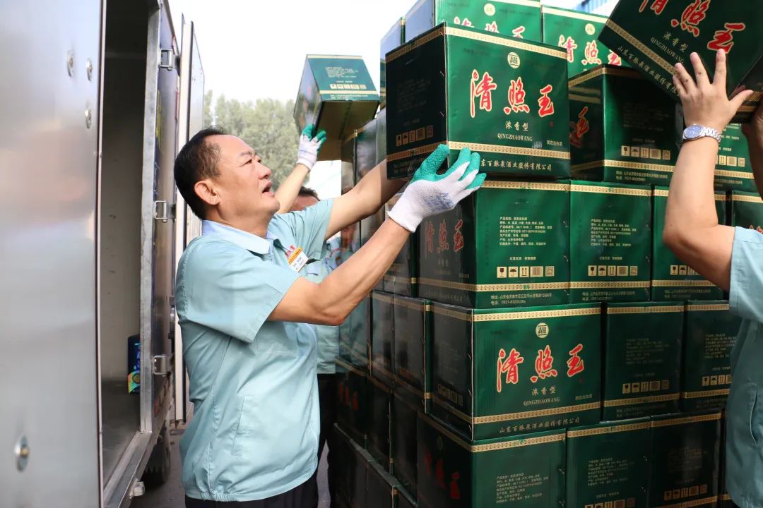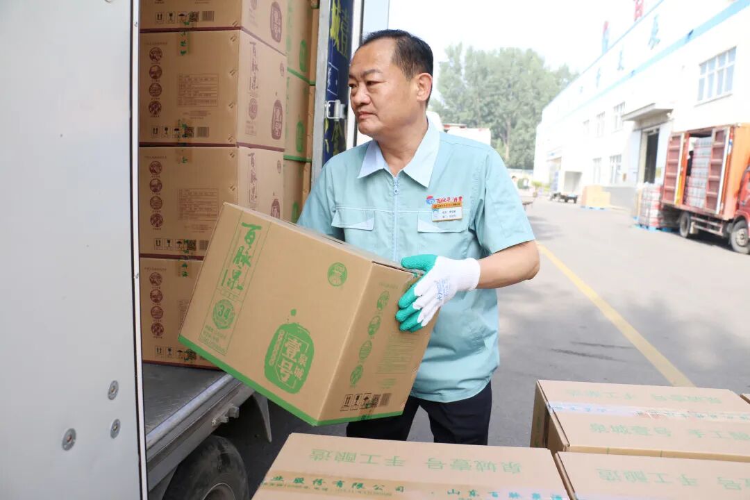 济南市食品工业协会会长,百脉泉酒业党委书记、董事长李成新带领全体后勤人员装车