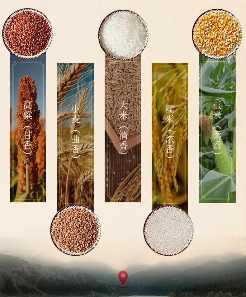 每一滴兰陵王酒的酿造,都采用高粱(甘香)、大米(清香)、糯米(浓香)、小麦(曲香)、玉米(柔香)五种粮食为原料,纯固态发酵。
