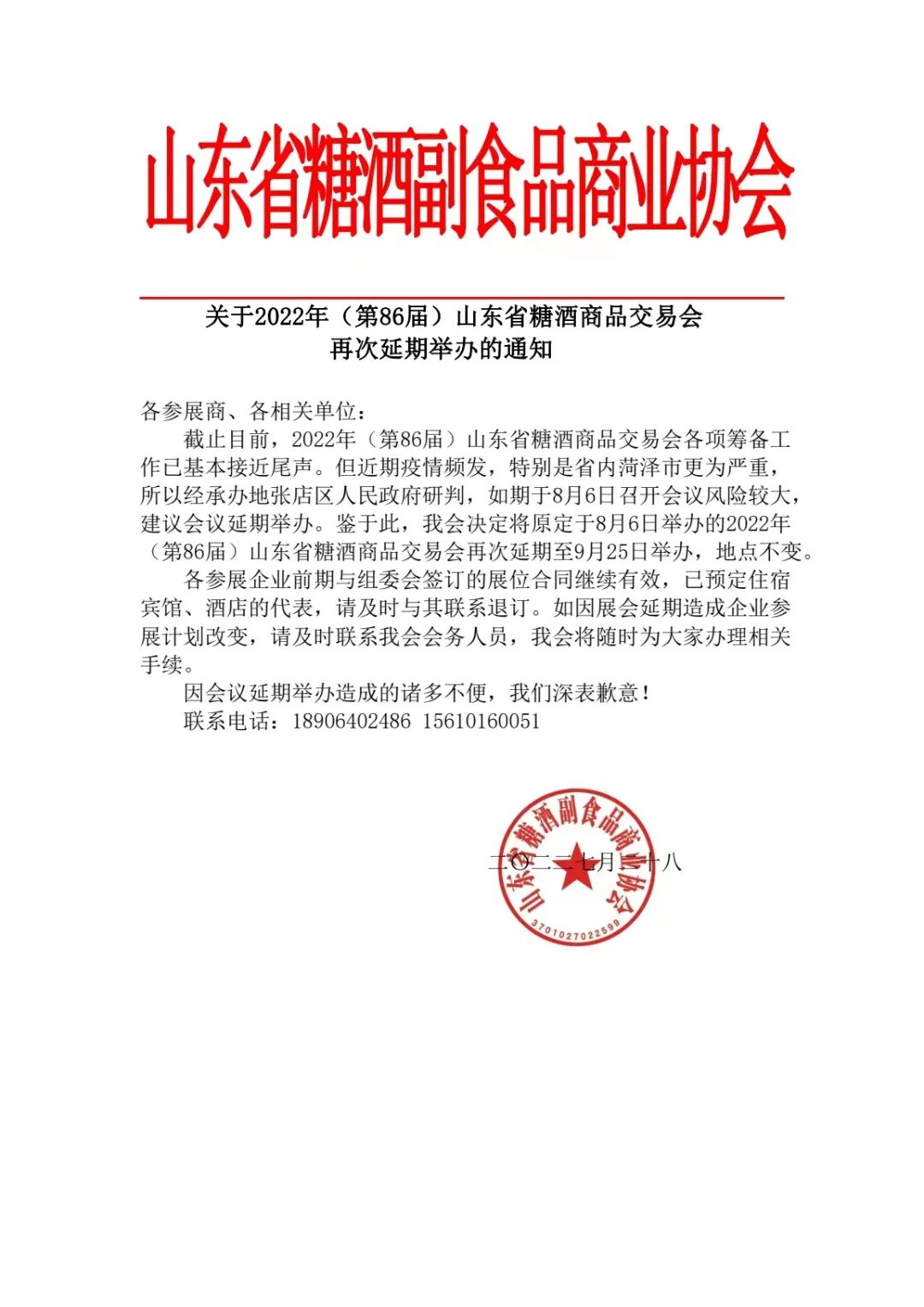 近期疫情频发,为了配合疫情防控工作,2022年(第86届)山东省糖酒商品交易会再次延期至9月25日举办。因会议延期造成的诸多不便,敬请谅解。