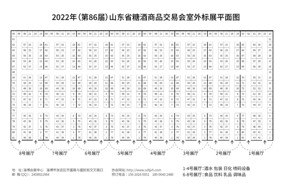 本届交易会主会场设在具有“淄博珍珠”之称的气模式结构的淄博会展中心,规划展出面积5万余平米,其中室内面积2.7万平米,室外面积2.5万平米,设置特装展位170余个,标准展位700多个,桌凳展位700余套,灌装展位若干个,总体规模与上届会议基本持平。会议参展范围包括酒类、食品、饮料、乳品、调味品、灌装、包装、日化等行业,除我省大部分相关厂商外,预计全国其他20多个省市的工商企业也将参加我省糖酒会。