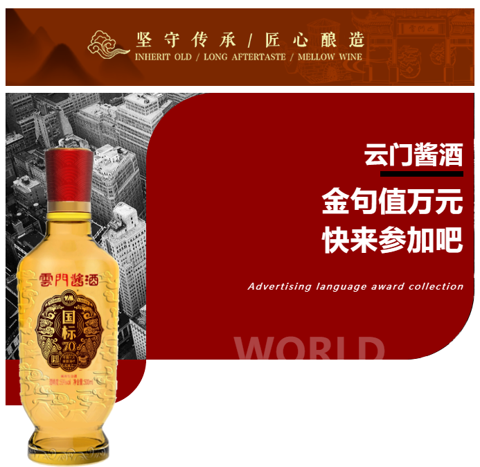 如今,为促进云门酱酒品牌化方向发展,树立云门酱酒全新广告形象,经集团战略规划决定,特此向全社会开展新时代、新阶段“云门酱酒”广告语征集活动,欢迎社会各界人士发散思维,集思广益,为云门酱酒品牌建设一展才华!