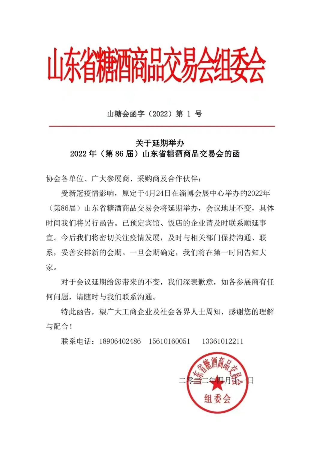 2022年(第86届)山东省糖酒商品交易会将延期举办