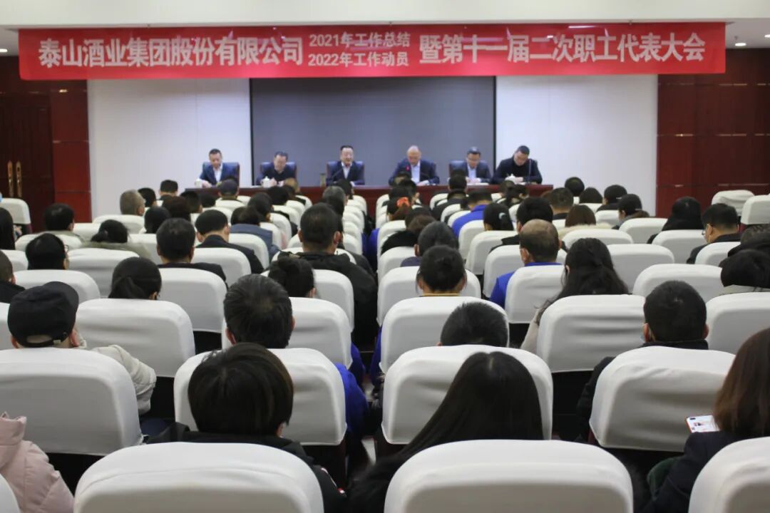 董事长在总结动员大会上作了《开启新征程,一起向未来,为实现企业高质量发展而努力奋斗》的重要讲话。他首先对国内白酒行业发展形势和鲁酒发展现状进行了详细梳理,随后用“九个新”全面总结了公司在2021年所做的主要工作和取得的主要成绩。一是主要经济指标取得新成绩,收入、利税再创历史新高;二是营销工作实现新突破,稳如泰山俱乐部建设成最大的模式创新,助力大单品持续增长;三是品牌建设成为新亮点,通过持续加大广告投放力度,泰山品牌建设提升到一个新的高度;四是企业管理又上新台阶,重视制度管理,规范工作流程,管理体系监督检查得到加强,财务管理规范有序;五是产品质量得到新提升,原酒生产进步明显,勾调技术更加成熟,产品检验更加严格,部门配合更加紧密;六是安全生产再创新纪录,安全形势保持基本稳定;七是泰酒文化再添新内涵,独家冠名《齐鲁文化大会》,将泰山酒文化与齐鲁文化巧妙结合,在社会上引起了强烈的反响;八是相关产业得到新发展,东平郡酒业快速崛起,公司资本运作安全高效,农大肥业、生物工程都未来可期,主业和相关产业都创历史新高;九是公司上下呈现新面貌,员工工作积极性、主动性空前提高,共享企业发展成果。