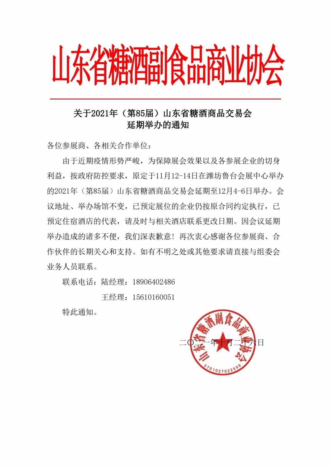 鉴于近期新冠肺炎疫情影响,经研究决定,原定于2021年11月12-14日在潍坊鲁台会展中心举办的2021年(第85届)山东省糖酒商品交易会延期至2021年12月4-6日举办。