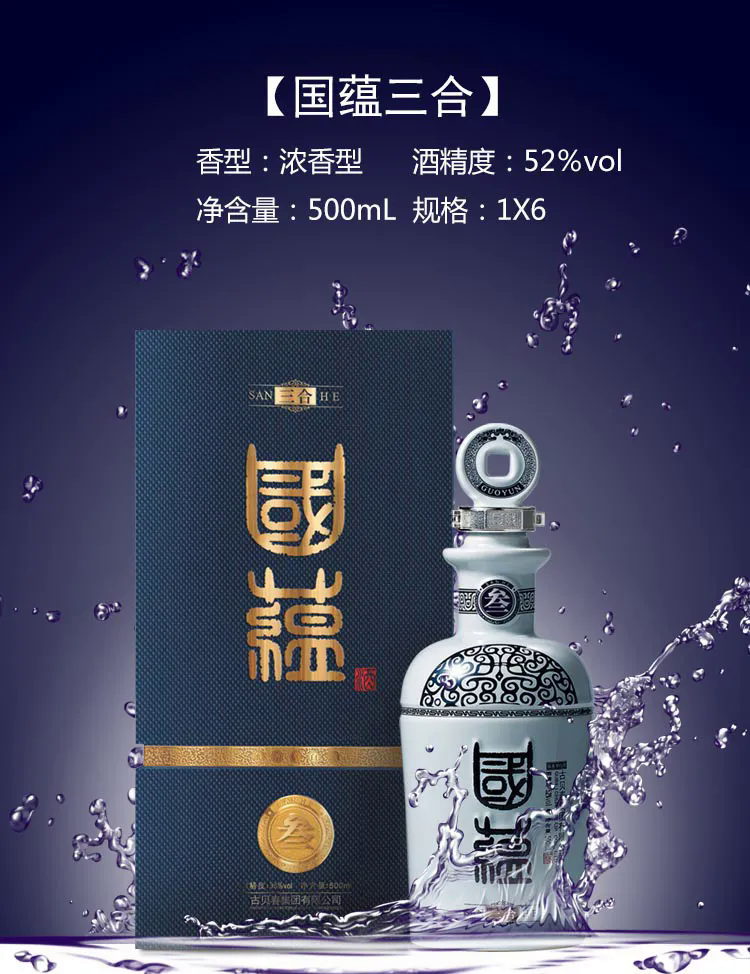 国蕴三合酒,"国"者,酒之瑰宝,藏大国品味;"蕴"者,海纳百川,蕴稀有臻品,是古贝春集团研发的高端浓香型产品。历经两年多的市场调研,由中国白酒大师吴兆征带领的专业攻关团队精心研制而成。并凭借其优质的口感和高端的品质获得市场和消费者的高度认可。