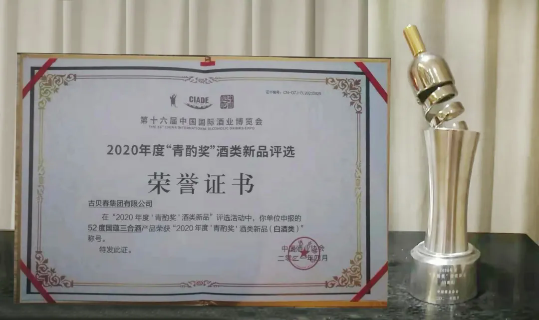 4月8日,由中国酒业协会主办的"2020年度'青酌奖'酒类新品"评选在泸州市巨洋会议中心举行。本届“青酌奖”酒类新品评选汇聚了各大酒种的年度新品,按照活动规则,评委由专业评委、消费者评委、媒体评委及经销商评委组成,对参选酒品的色泽、口感、风味、风格及市场认可度等进行全面综合评定。古贝春集团出品的52度浓香型国蕴三合酒,在百余款白酒样品酒中脱颖而出,荣膺此项殊荣。