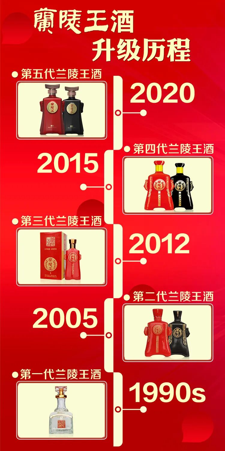 上世纪90年代,随着国民经济的快速增长,第一代兰陵王酒面世,为鲁酒高端化打开了大门;2005年第二代兰陵王酒将产品和品牌文化相融合,开创了兰陵王酒王者归来的新格局;2012年通过技术创新,推出了38%vol五粮升级版兰陵王酒,并荣膺中国白酒酒体设计奖;2015年,在全民喝好酒的时代,兰陵为迎合消费者在品质方面等需求,全新升级发布了五粮型兰陵王酒,并荣获中国白酒酒体设计奖。