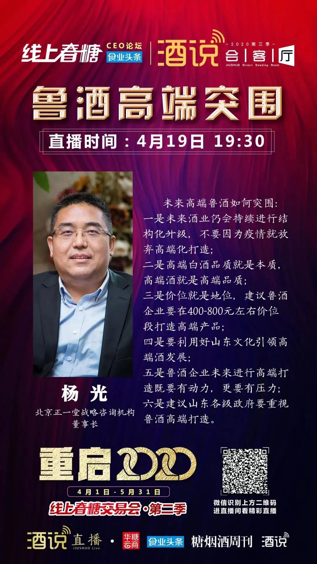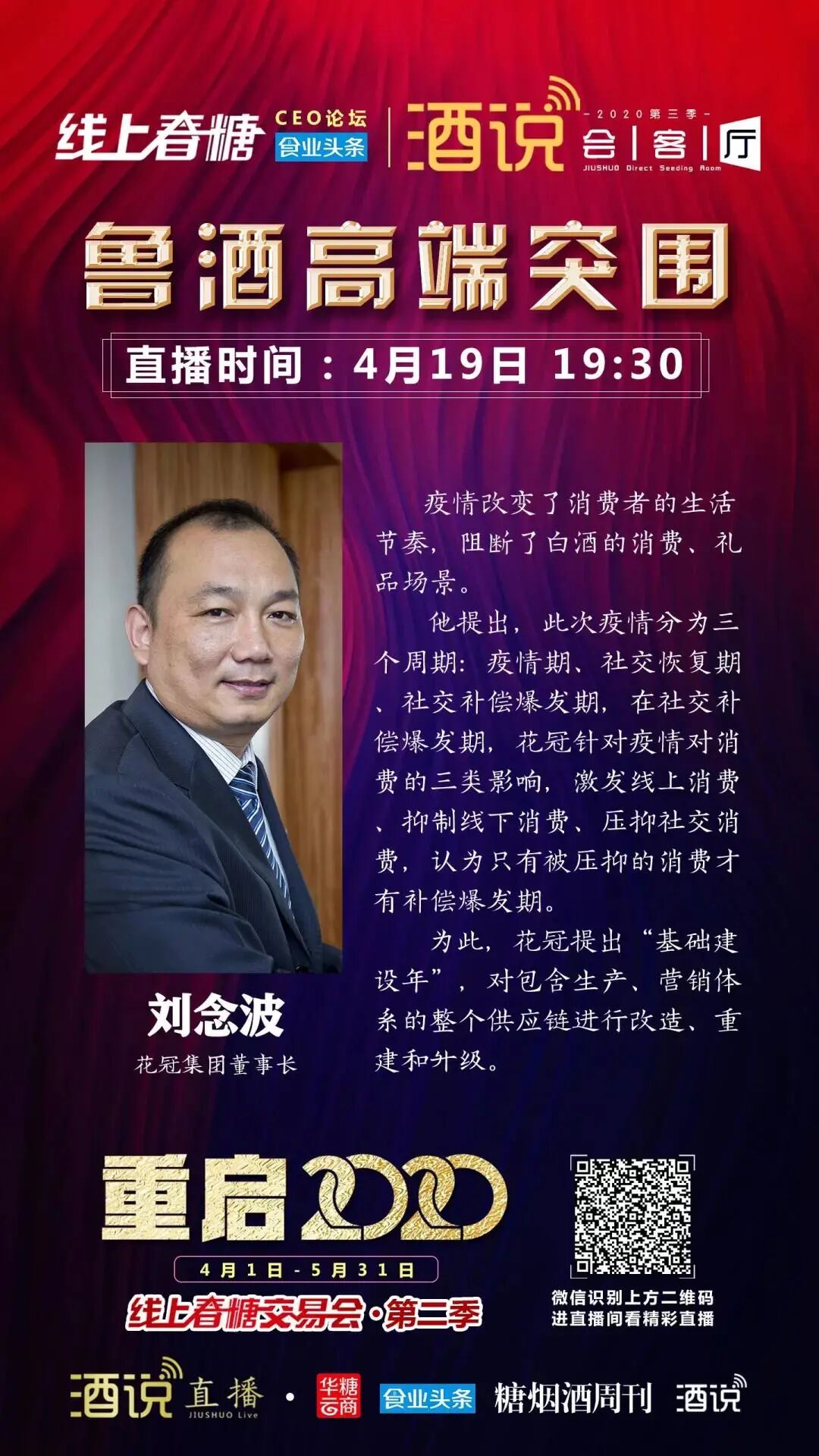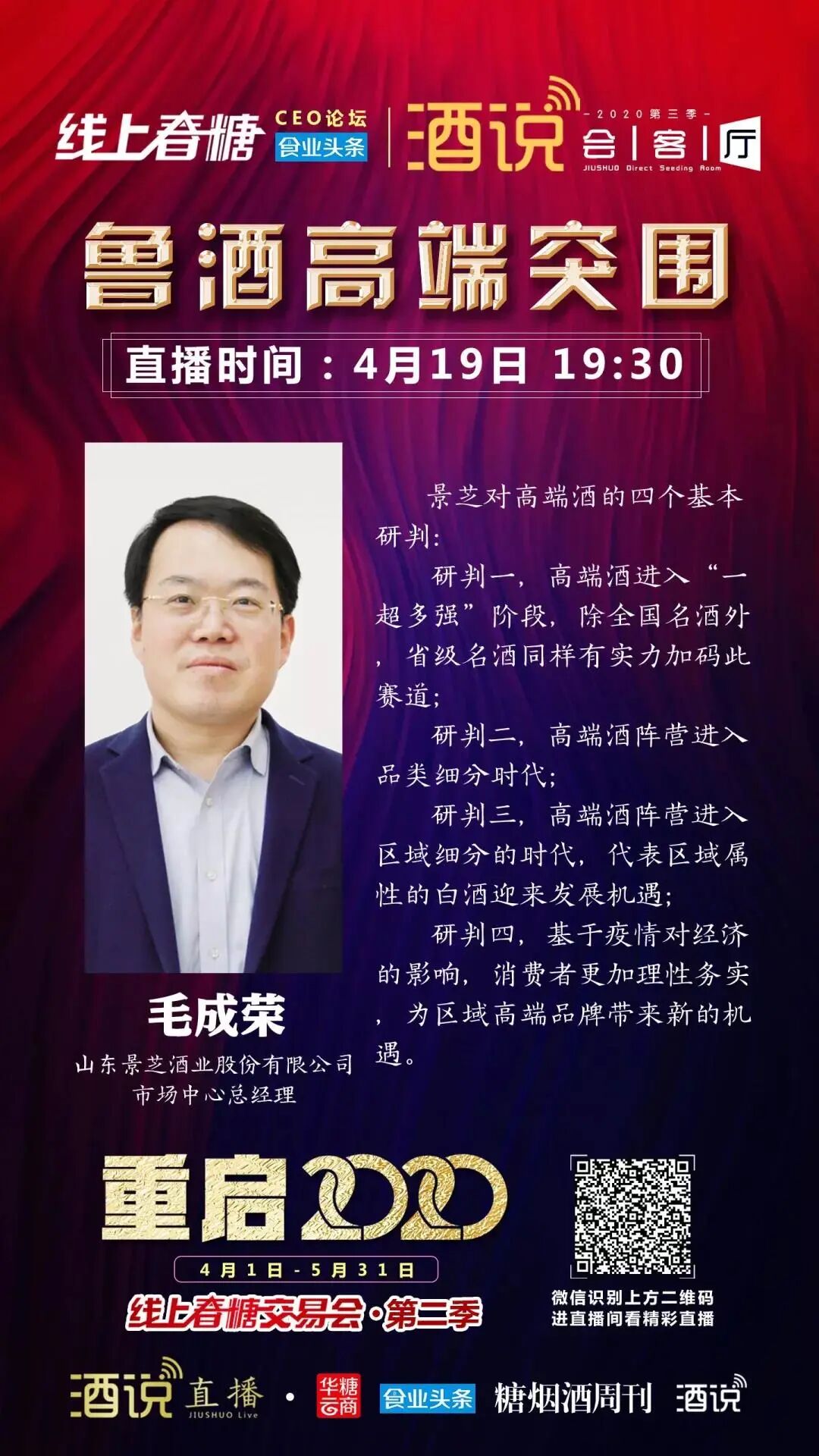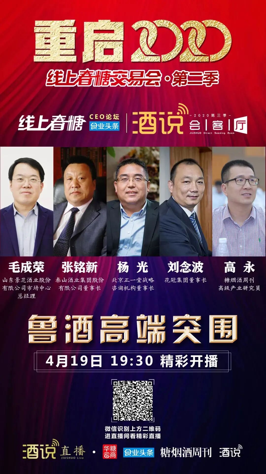 “高端价值,鲁酒担当;品质为基,文化弘扬……”!花冠、景芝、泰山等高端鲁酒骨干企业2019年末的“泰山宣言”言犹在耳。4月19日晚,华糖云商“酒说会客厅”牵线搭媒,北京正一堂战略咨询机构董事长杨光、花冠集团董事长刘念波、泰山酒业集团股份有限公司董事长张铭新、景芝酒业销售公司市场总监毛成荣再度“云聚首”,探索疫情之下鲁酒2020年如何在保持现有基础上实现高端品牌突围?在品牌力的外延和扩充中,新高端鲁酒又将如何实现突破?