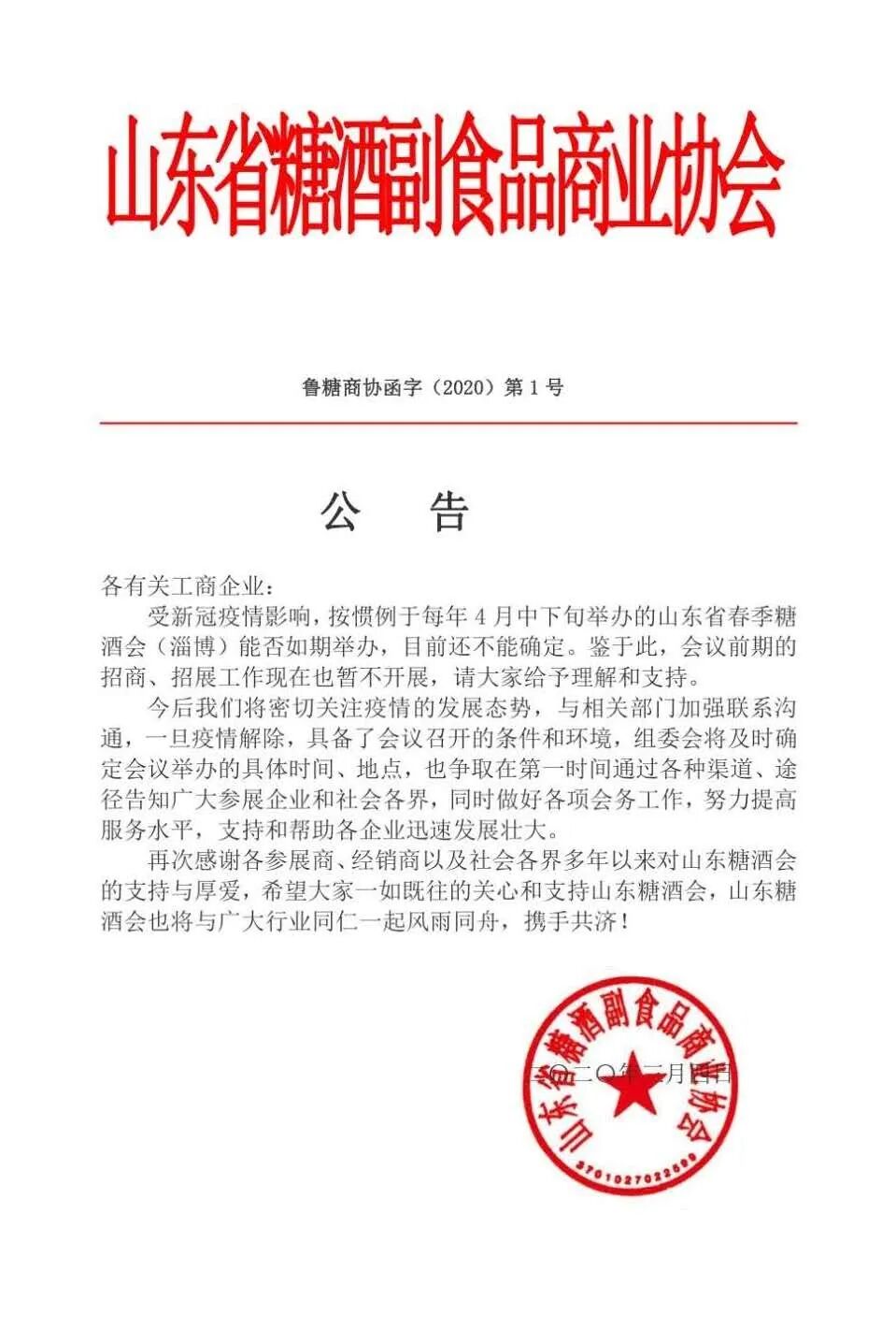 受新冠疫情影响,按惯例于每年4月中下旬举办的山东省春季糖酒会(淄博)能否如期举办,目前还不能确定。鉴于此,会议前期的招商、招展工作现在也暂不开展,请大家给予理解和支持。