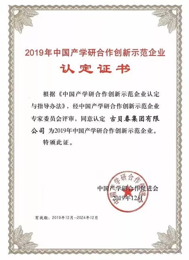 2019年12月26日,古贝春集团被山东省工信厅认定为“山东省技术创新示范企业”与此同时12月30日第十三届中国产学研大会在北京召开,国家教育部、国家科技部、国家发改委、国家工信部等部委领导参加,古贝春集团有限公司再获国字号殊荣,被认定为“中国产学研合作创新示范企业”,全国共计八十余家企业入选,白酒企业仅两家入围。
