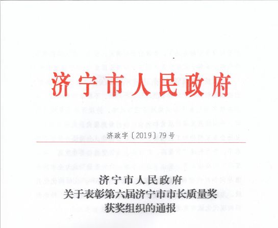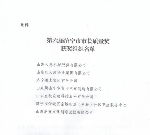 2019年12月26日,济宁市人民政府正式印发了关于表彰第六届济宁市市长质量奖获奖企业的通报文件。根据《关于转发鲁评组函[2019]8号文件做好批复评比达标表彰项目组织实施工作的通知》和《山东省省长质量奖管理办法》,山东红太阳酒业集团有限公司等7家单位被授予第六届济宁市市长质量奖荣誉称号。