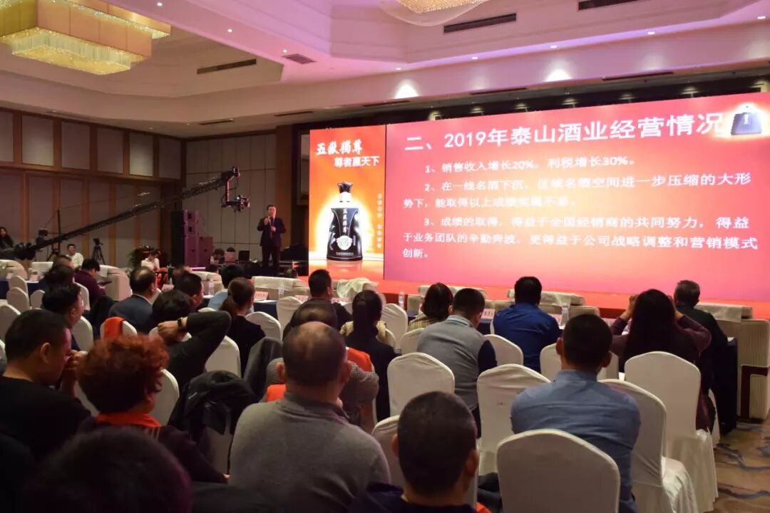 在随后举行的泰山酒业集团营销年会上,泰山酒业集团副总经理吴修刚向与会嘉宾详细介绍了泰山酒业2019年的经营情况。在一线名酒下沉,区域名酒空间进一步压缩的大形势下,2019年泰山酒业集团取得了销售收入增长20%,利税增长30%以上的优异成绩,这不仅得益于全国经销商合作伙伴的共同努力,得益于业务团队的辛勤奔波,更得益于企业战略调整和营销模式创新。