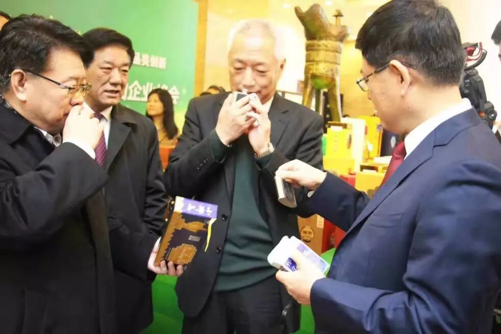 青岛琅琊台集团董事长李悦明(右一)向山东省副省长凌文(右二)介绍71度小瑯高