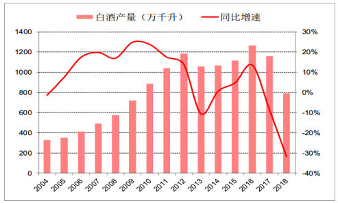 数据显示,2016年,全国白酒行业产能约为1300万千升,2017年下降至1100万千升,2018年更下降至871.2万千升。2017-2018年增速放缓为负增长,2018年白酒产量同减32%至79亿升。业内人士表示,预计未来会下降到600万千升。