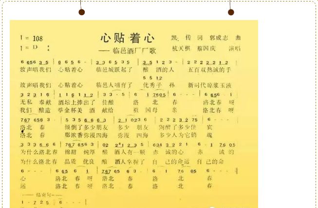 1990年,歌曲《心贴着心》由凯传填词,郭成志谱曲,蔡国庆、杭天琪共同演唱,是山东省临邑酒厂厂歌。