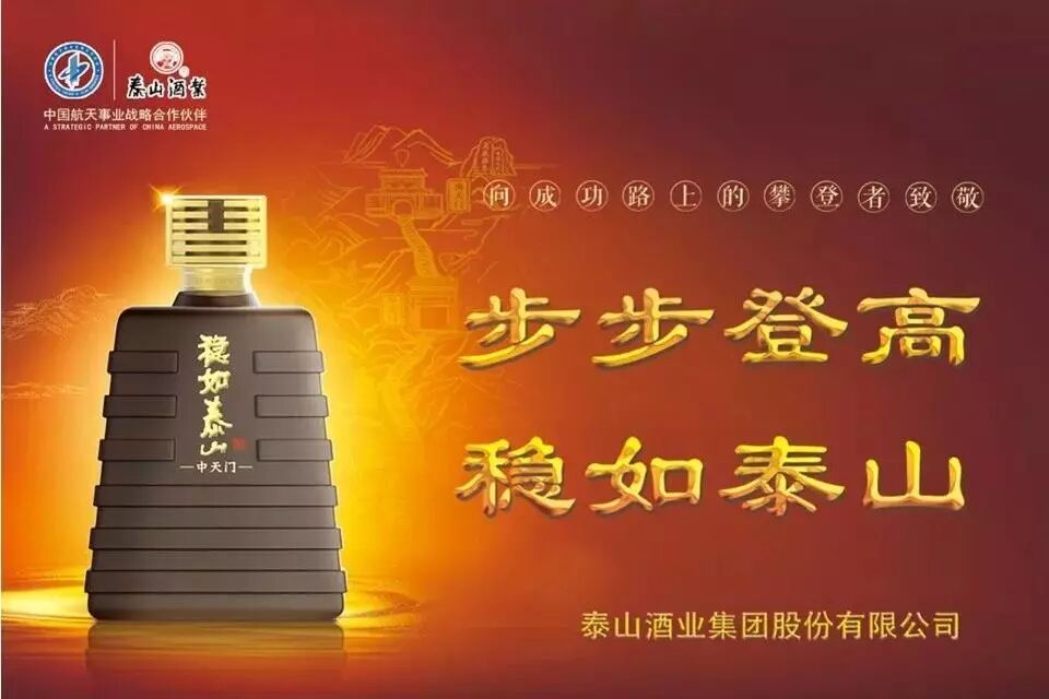 为了更好地提升品牌高度,泰山酒业集团自2010年牵手中国航天以来,已连续9年为中国航天喝彩,成为中国白酒行业唯一的“中国航天事业战略合作伙伴”和“中国航天庆功酒”。同时,泰山集团还冠名十列“泰山酒业”号高铁品牌专列;在山航120多架飞机上,泰山品牌以多种形式得以传播。